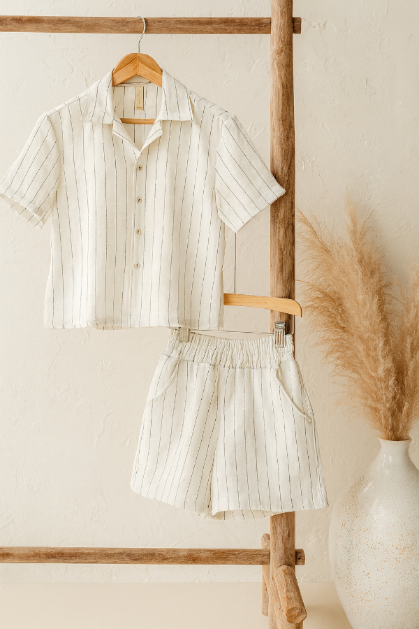Incluye camisa con botones al tono y bermuda con bolsillos, de corte baggy para mayor comodidad y estilo.
