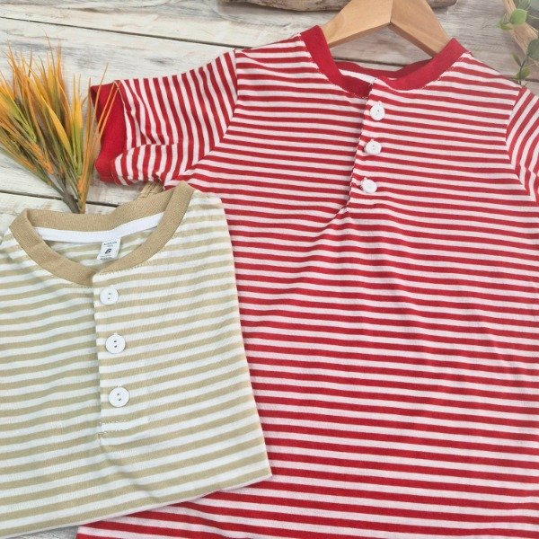 Remera confeccionada en jersey de algodón con un encantador estampado de mini rayas. Tiene cuello tipo chomba y botones delanteros en color blanco, que combinan perfectamente. Disponible en rojo y blanco/beige y blanco¡Ideal para un look casual y lleno de estilo!