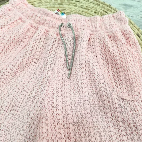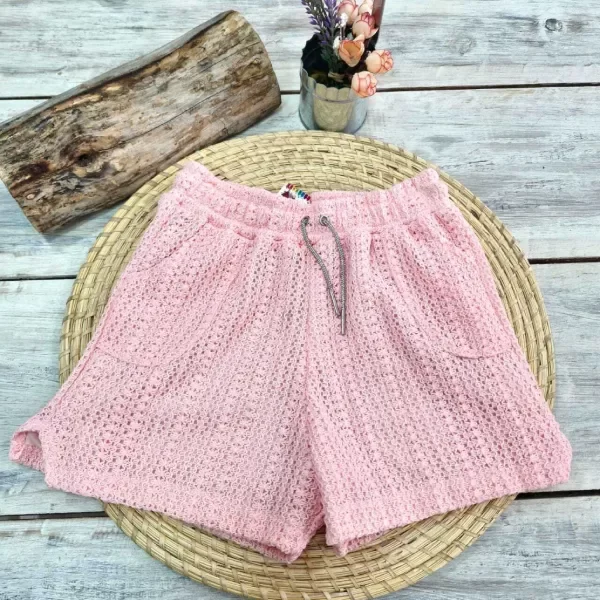 Short color salmón súper delicado, tejido en crochet —un material en plena tendencia— que combina textura y estilo.