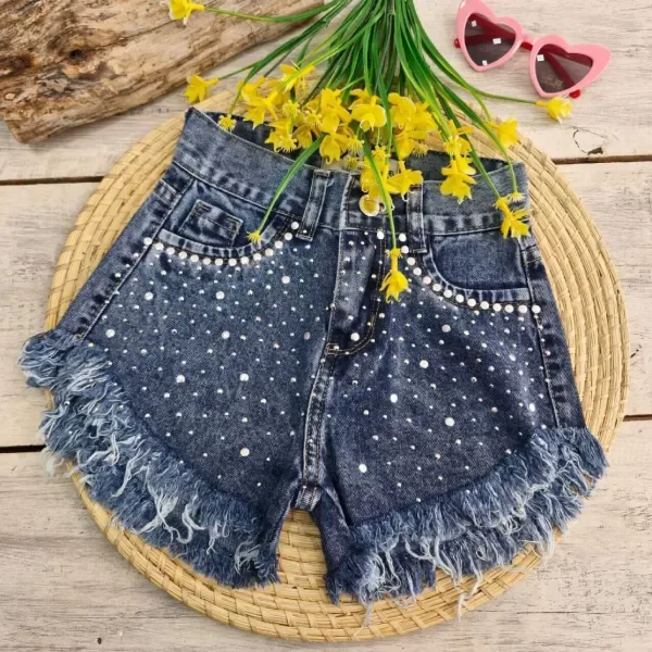 Short de jean rígido corte americano, con piernas más cortas adelante que atrás y terminación desflecada, ideal para un look moderno y canchero.