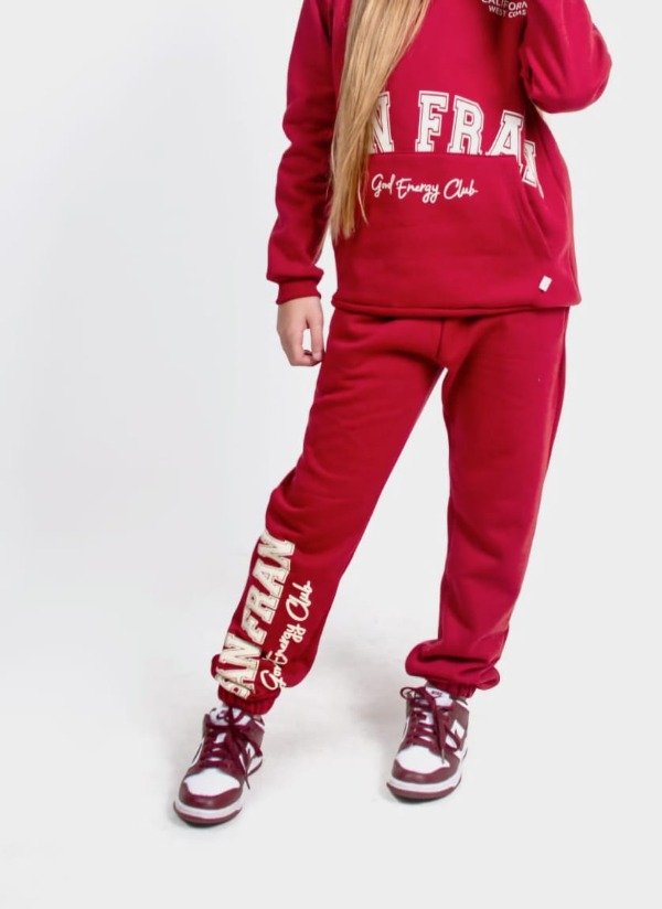 Un básico con estilo urbano. Pantalón de algodón frizado en color bordó, con elástico en los puños para un calce cómodo y moderno. Tiene estampa lateral en una pierna que dice “San Francisco” en contratono natural, sutil pero con mucha onda. Ideal para todos los días.