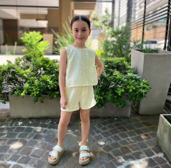 Conjunto de short + musculosa confeccionado en cey puf color amarillo pastel, con delicadas flores blancas estampadas que le dan un toque súper fresco y femenino.