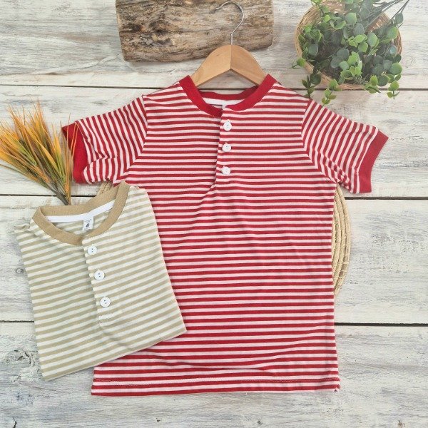 Remera confeccionada en jersey de algodón con un encantador estampado de mini rayas. Tiene cuello tipo chomba y botones delanteros en color blanco, que combinan perfectamente. ¡Ideal para un look casual y lleno de estilo!