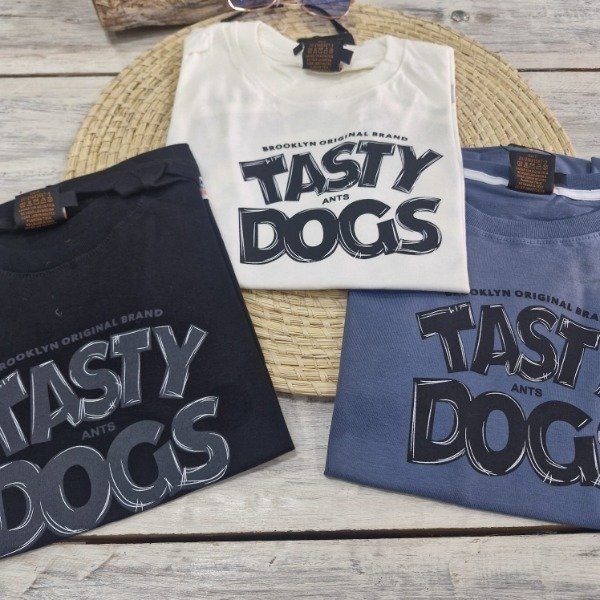 Presenta una estampa de perro y la palabra “TASTEY”, divertida y canchera, ideal para los peques con estilo propio.💛 6 Kids → 3/4 año