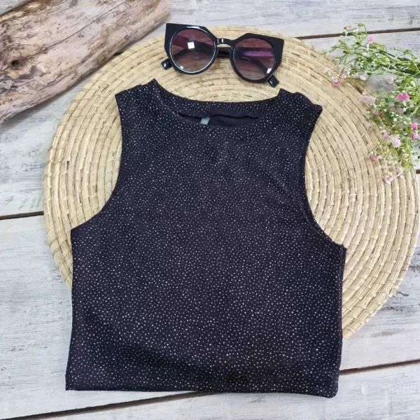 Musculosa corte americano tipo top, en color negro con glitter plateado, ideal para un look moderno y con brillo.