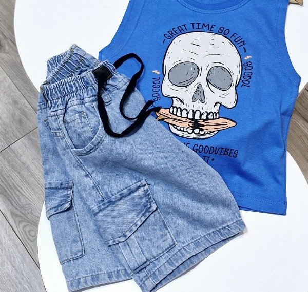 Bermuda de jean color celeste con bolsillos cargos y elástico en la cintura.